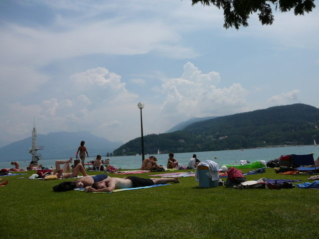 由Chamonix來到全歐洲水質透明度最高的安西Annecy湖,湖水冰涼透心,清澈見底,景色如詩如畫,愛水的這一家人,受到冰涼沁水召喚,迫不及待的下了水。湖畔有不少大方裸體女曬客,大慨是法國人生性大方、愛好自由吧!從未見她們有害羞扭捏態。Annecy湖畔寧靜優雅,釋放著讓人情緒放鬆的氛圍,全家人竟一致通過此為最佳度假地點,期約下次再來。