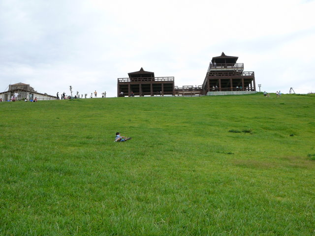 沿途路標清楚,跟著指標而走,經過高台茶葉展示中心後不遠,偌大綠草如茵的寬闊斜坡映入眼廉,此處是花東縱谷國家風景區規劃的高台飛行傘訓練示範場。不少遊客帶著自行準備的道具在此進行滑草活動,簡單的只是片厚紙板,講究一點的甚至把大型帶輪水果藍都拿來,坡度陡斜,由坡頂滑下速度飛快,頗具刺激,但是因乏人管理,實在有些危險,有幾次看到滑下的遊客煞不了車,差點摔倒!