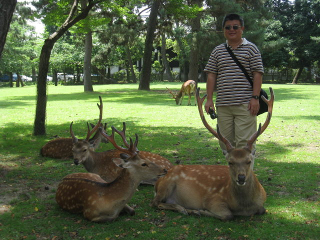 從京都搭JR奈良線約50分鐘左右就到了奈良車站,請教旅遊服務中心的人員之後,往東大寺的方向前進,走沒多久,路邊的景緻卻像誤入動物園般,綠色的草地上到處都是美麗的梅花鹿,三五成群,或是玩耍或是悠閒坐著休息,頓時間所有遊客的焦點全聚在鹿群身上,興奮的按著快門,差點忘了此行的目的地是東大寺!幾年前冬天曾到宮島的嚴島神社旅遊,拍照時手上的地圖被飢餓的鹿搶走,來不及反應,就眼睜睜看著地圖滑進鹿的嘴裡,逐漸消失在空氣中,因此特別提醒太太小心點,免得趣事重演。緯來有名的日劇「鹿男異想世界」就是以奈良的神鹿為劇情發展主軸。