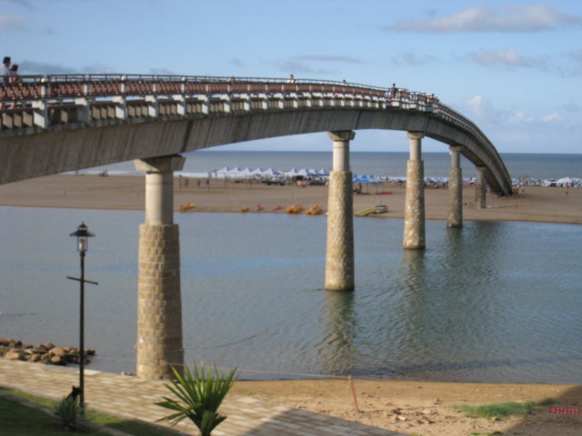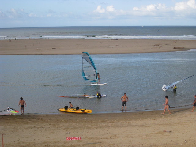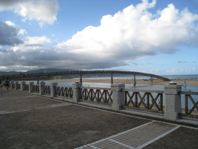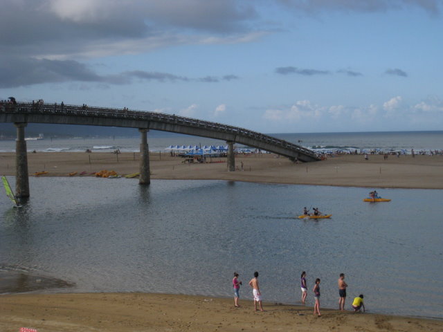 沿著蔚藍大道直走,拱形的木造彩虹橋跨越雙溪河,連接酒店與海邊的沙灘,雖然每年都來,彩虹橋與綿延3千公尺的沙灘,可說是台灣的黃金海岸,不停下來欣賞一番,那捨得下水。橋下有人玩風浪板、獨木舟及帆船,對面東興宮前的海面上,則是一群衝浪客正在與大浪競速呢!