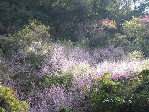 除了山櫻,台14線上更是處處可見白色李花和淺粉色的桃花,桃李爭相綻放,急著和櫻花爭妍比美,和山櫻的豔麗比起,白色的李花較為清新脫俗,而粉紅色的桃花顯得青春浪漫,各有特色風采,哪個美哪個吸引人,各有粉絲支持者吧!路旁一處私人果園,種了一大片的桃花李花,遊客很少不被那美麗的景觀吸引而停車拍照,和此桃紅花海比起,貓空的杏花林就顯得略為稀疏些許,數大真是美,我還是第一次領會到什麼是『桃李滿天下』!