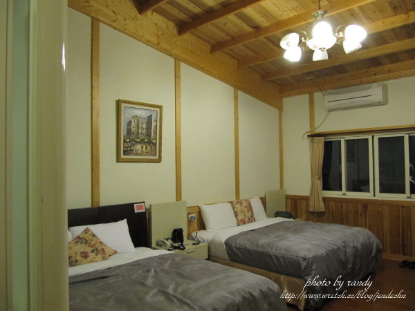 我們住在二樓的歐風弦月四人房,每晚3200元,大部分建材都是以原木為主,室內佈置簡單而顯質樸溫馨,房間寬敞,還有個很大的陽台。走進房間,往陽台望去,薄霧中的埔里市區近在咫尺,天色漸暗彷彿置身清境的民宿呢!緊鄰陽台的浴室,有一個大型的浴缸,適合兩人一起泡澡,大片的景觀玻璃,讓人可以躺在浴缸中,邊泡澡邊欣賞埔里的夜景,貼心的設計為月牙莊加分不少呢!