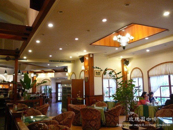 「玫瑰園」的建築和庭園造景相當吸引人,進入後發現室內佈置很豪華,可說是美輪美奐,寬敞的空間放置了不少綠色植物,柔和了深色的花色沙發,靠庭園處設計了拱型格子玻璃,配上白色窗簾、紅色玫瑰花,讓餐廳顯得優雅浪漫。
