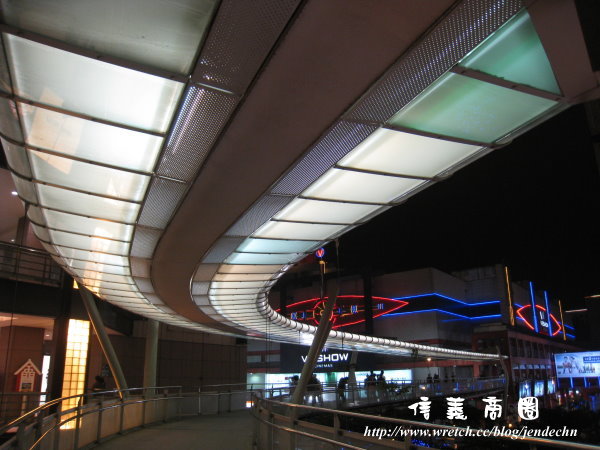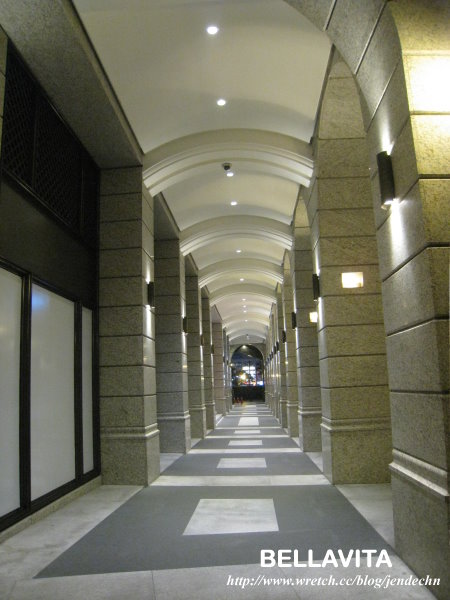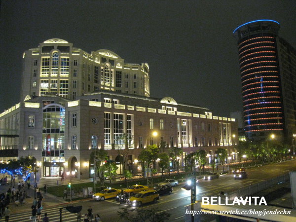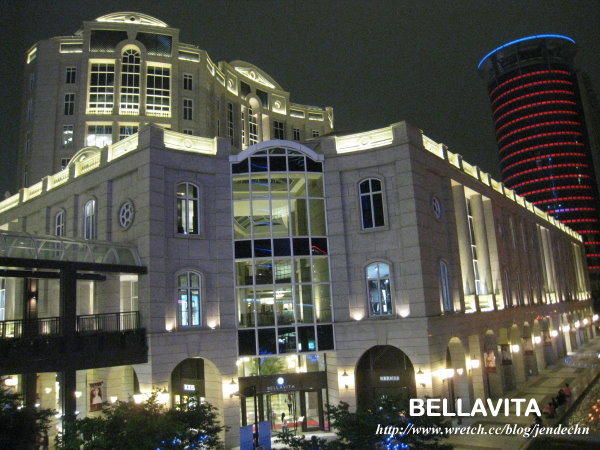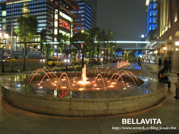 用完餐後,走到戶外的音樂噴泉,欣賞街頭藝人的表演,隨後走上二樓的空廊,準備往101的方向走去,回眸一瞥,發現「BELLAVITA」在燈光的投射下,美得令人陶醉,不忍離去!