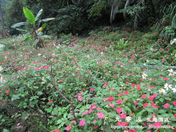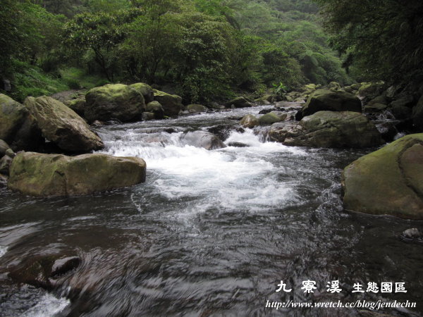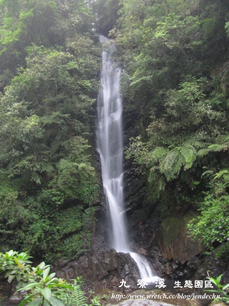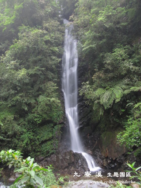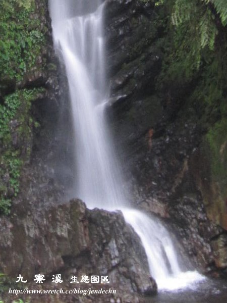 舒適的步道盡頭,換成緊貼山壁的小徑,可能是之前水災的緣故,欄杆搖搖欲墬,走一段後小徑消失不見,只得隨著「九寮溪瀑布」的指示牌,穿梭於樹林和溪流間,一會兒攀爬溪邊的滾石,一會兒穿越溪中的臨時便橋,正在徬徨之際,傳來陣陣的瀑布聲,心情頓時開朗,再經過一段陡坡後,瀑布終於映入眼簾,若不是時間太晚,真想沐浴在沁涼的溪水中呢!