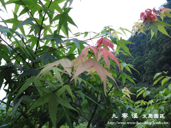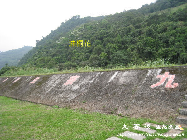 從宜蘭市沿著台7線往太平山的方向,看到台灣中油大同加油站旁的小路右轉,即為九寮溪自然生態園區的入口,堤防上的「九寮溪自然生態園區」的字眼,被青苔及雨水沖刷,已經有點模糊不清,第一次站上堤防,除了對岸的山坡上幾株油桐花抓住我的目光外,實在引不起探訪的興趣。