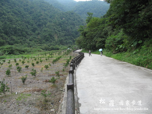 從停車場走到步道入口約1.5公里,沿著松羅溪而行,除了田野景色,溪畔種植的西瓜、瓠瓜、絲瓜‧‧‧,更是吸引遊客的目光,步道入口前的觀魚區,封溪復育的成效可觀,涼風徐徐吹來,坐在石頭上觀賞優游自在的魚兒,不失為一大享受!