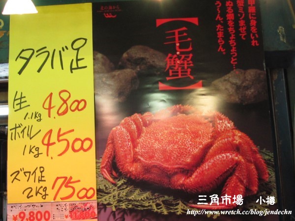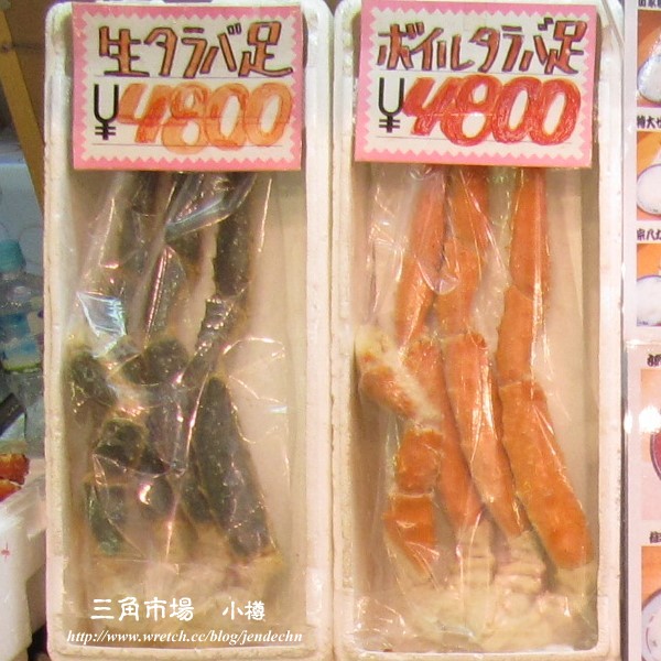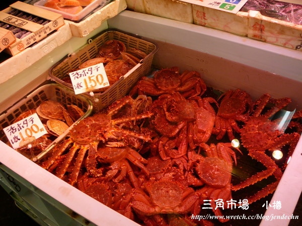 走了幾個攤位,發現他們也有類似台灣的作法,在攤位買了海鮮之後,再請店家烹調,商家還主動說可以打折,原價7000日圓的帝王蟹(鱈場蟹),可以算我們5000日圓,果然是觀光區,價錢很有彈性。
