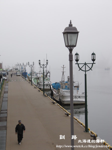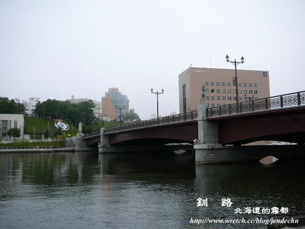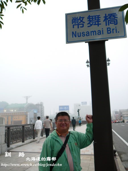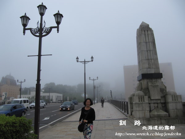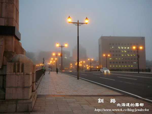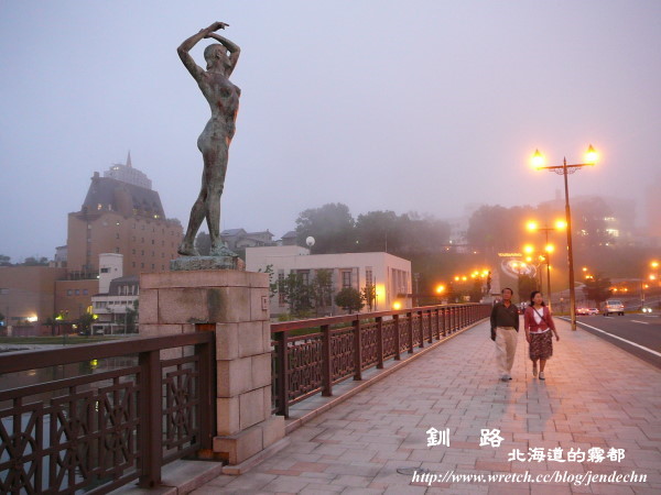 走到釧路川時,看到了一座十分美麗的橋樑,老婆指著遠處的標示牌,說「那是舞弊橋!」,我笑著說「是幣舞橋,不是舞弊橋!」。幣舞橋橋上裝飾著代表春夏秋冬的青銅像,薔薇花圖案鐵欄杆,是北海道三大名橋之一(另兩個是札幌的豐平橋和旭川的旭橋)。站在幣舞橋上,望著霧中的釧路港,美的令人屏息!當天色昏暗,溫柔和煦的燈火逐漸點亮,迷濛霧色中的黃色燭燈更是美的令人銷魂,難怪吸引不少攝影人士前來拍攝!