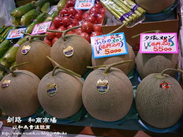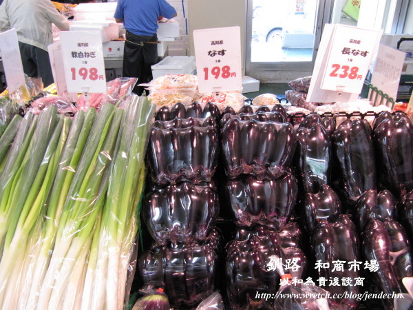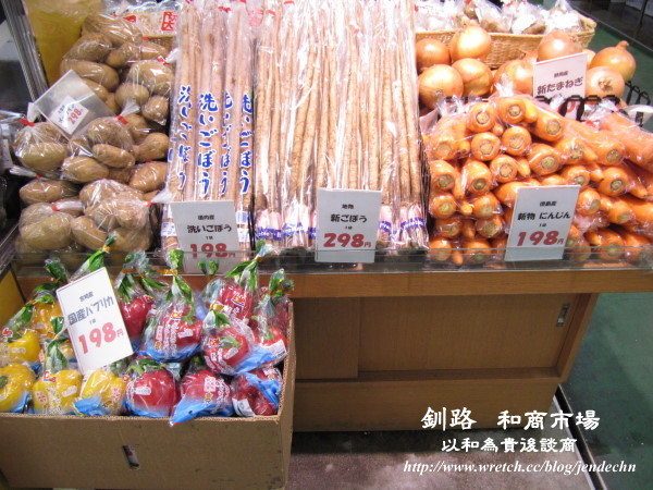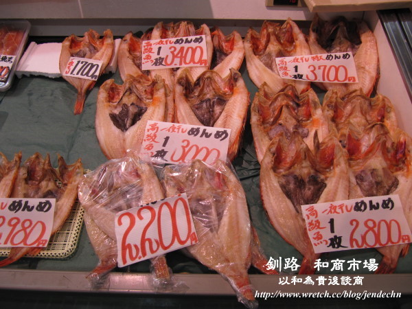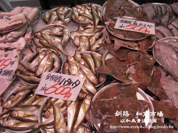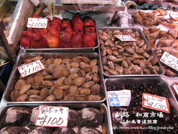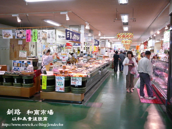 和商市場位於釧路JR車站附近,附近海域捕獲的新鮮漁產聚集在此交易,各式的海產和乾貨在市場內幾乎都可以找到,還有幾家專賣北海道名產的店,我們還發現和商市場內所標售的價錢比起其他市場還來的物美價廉!在北海道只要同牌子的相同產品,不管在產地或是觀光勝地,標價幾乎都一樣,不太會被敲竹槓,但是新鮮海產或農產品,在產地與否,價差可能就很大了!那天在和商市場買了幾條知名牌子的煙燻干貝,雖然標價和其他地方也是相同,但是老闆打折特賣,所以售價還是比其他市場所問到的價錢便宜!