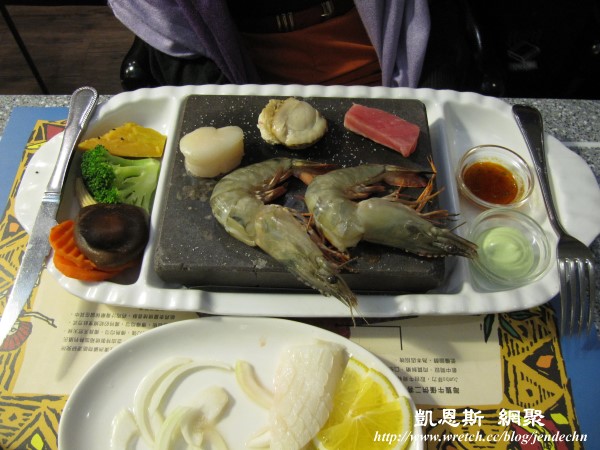 這家岩燒餐廳的作法,是先把岩石烤至400℃的高溫,再把食材放上石板,依照自己的喜好決定熟度,強調自由、自主、自然,有別於一般西餐廳先詢問客人要幾分熟,即使事後反悔,已無濟於事。根據服務人員的說法,石板的溫度在半小時內都可以把食物煮熟,如果只是保溫,則可以維持一個小時,上菜的方式也很特別,先上主菜再送上麵包和湯,主要是怕客人主菜還沒吃就已經飽了。
