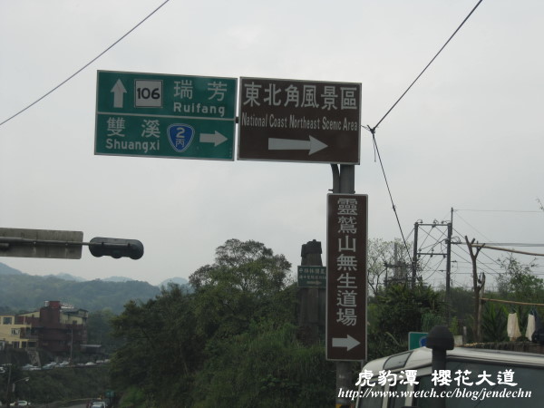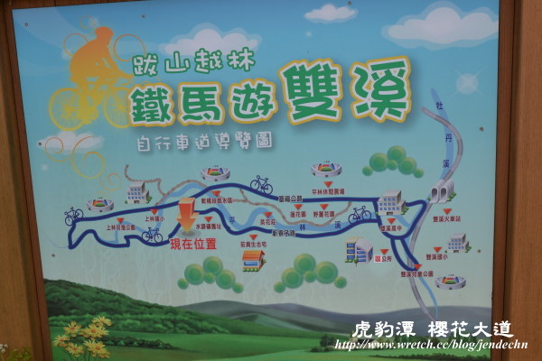 茶花莊到雙溪街上只要幾分鐘,在雙溪高中右轉接2丙,緊接著右轉進入雙泰產業道路(往泰平村)。雙泰產業道路又稱櫻花大道,整條道路非常美麗,種滿了櫻花和杜鵑花,而且植株密度之高令人訝異,走過台灣這麼多地方,很少看到道路兩旁櫻花密度這麼高的!曾在雙溪工作的朋友說,這些櫻花大約是十年前種的,難怪櫻花樹長的如此高大,雖已過了花季,只能看到幾株晚開的櫻花綻放,若在花季時節,可想而知那壯觀的美景!