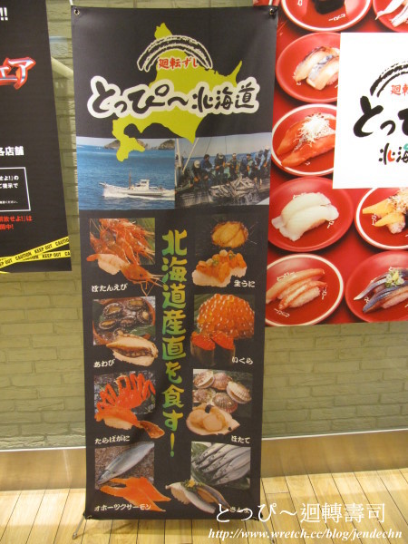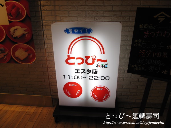 日本的火車站常常就是美味聚集的美食街,札幌車站亦是如此。第一天到飯店辦理入住手續後,到北海道廳舊本廳舍、大通公園‧‧‧散步,一路上都沒有看到中意的餐廳,後來走回札幌車站旁的エスタ百貨,看到美食街有「札幌拉麵共和國」,類似京都車站的「拉麵小路」,裡面有各地的拉麵。猶豫了一下,再往前走幾步,看到「とっぴ~迴轉壽司」,看起來生意不錯,喜歡壽司的我們一看就被吸引住了。