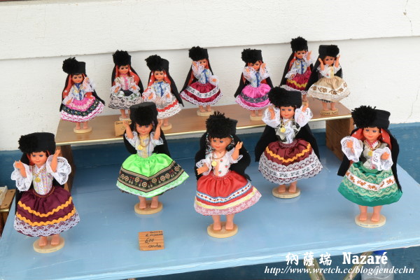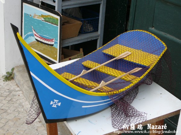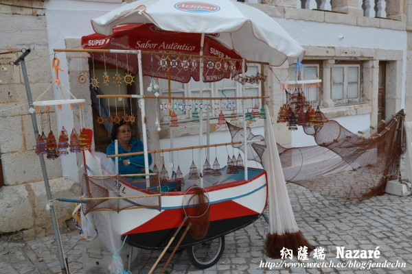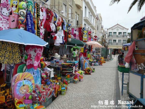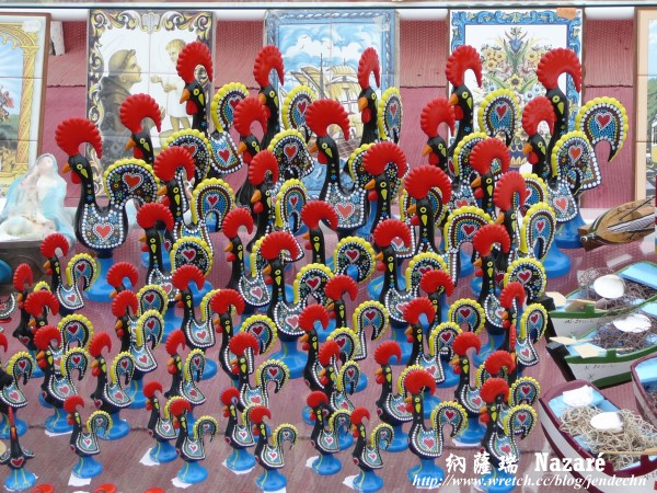 來納薩瑞的旅行團不少,山崖上擠滿了一團團看海的遊客,馬路兩旁的攤販也特別多,販賣商品中,「木製帆船」和「公雞商品」最吸引人,公雞是葡萄牙非常重要的民俗象徵,從布料、飾品、明信片、瓷磚、瓷器…到處都可以看到牠的圖像。典故來源是據傳有位朝聖者,在經過葡萄牙途中,被當地鎮民誤認是小偷,決定將他吊死,朝聖者為了證明清白,在法庭上當著法官的面指出,如果法官晚餐中的烤雞能夠死而復生,並且站起來啼叫,就代表他是清白的,結果居然發生了奇蹟,烤雞不但活了過來,還當場啼叫,因此這名朝聖者被當眾無罪釋放。死而復生的公雞神跡,在葡萄牙廣為流傳,成了最受歡迎的民俗藝術圖騰,除了當藝術品擺設之外,當然也是間接告訴客人,他們是童叟無欺的優良商家。