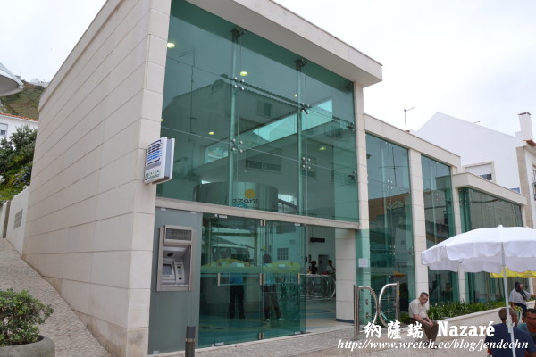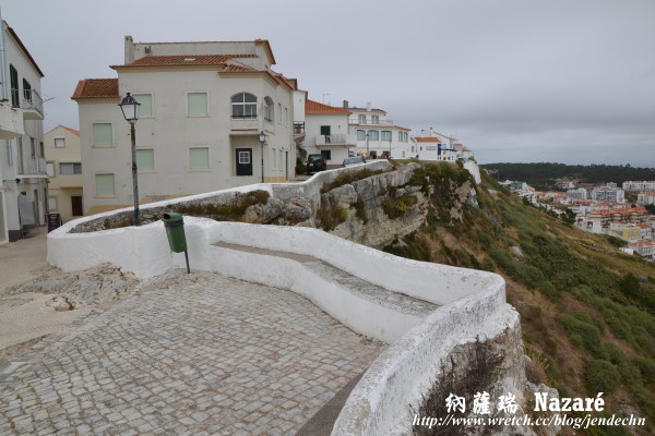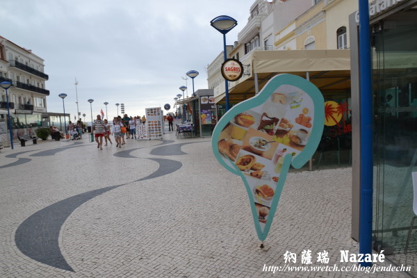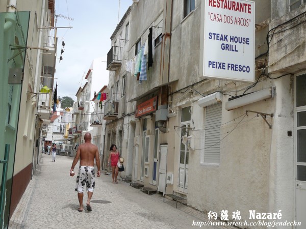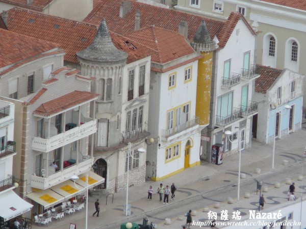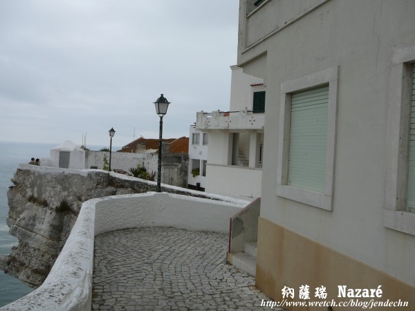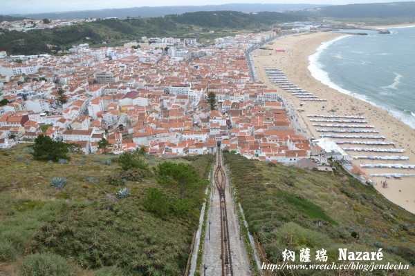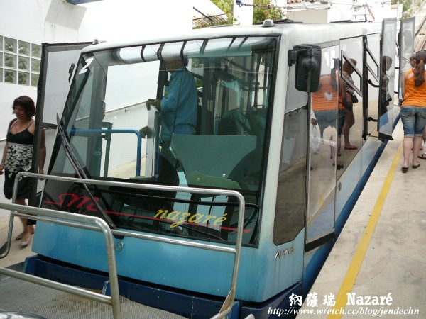 在台灣出發前,看到氣象報導說今年歐洲熱浪紅色警報,沒想到來到這裡,發現溫度沒有想像的高,早晚溫差又大,尤其葡萄牙更是涼爽,晚上還出現十幾度的低溫!我在波爾圖拍夜景時著涼了,到達納薩瑞時,身體感到不適,有點發燒,只好先到飯店休息,還好行前都會到醫生哪兒拿些備用藥,以備不時之需。吃了藥休息片刻,身體逐漸回復後,兩人才出門沿著海岸走。納薩瑞的觀光客幾乎都集中在海灘附近,沿岸都是商店和攤販,由海灘往山崖方向走,會看到路邊指標標示著「纜車站」,跟著指標很快就會到達纜車站。