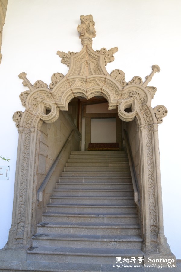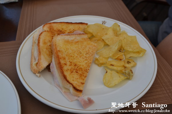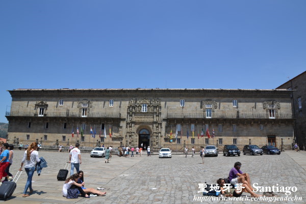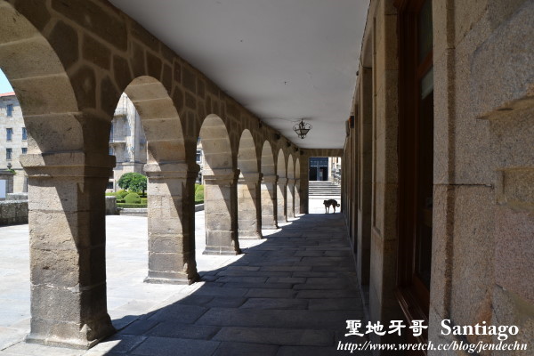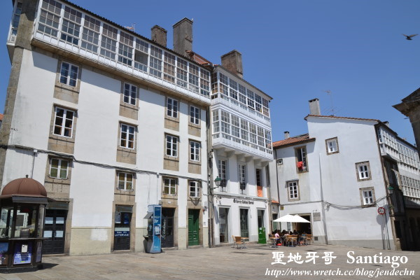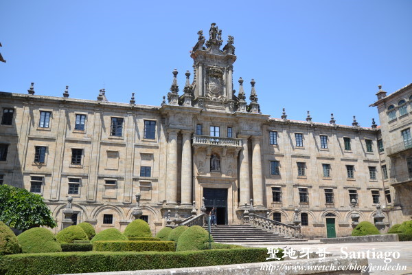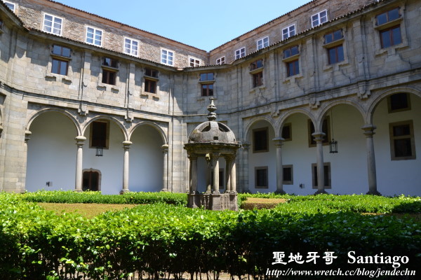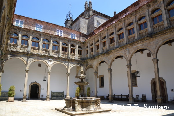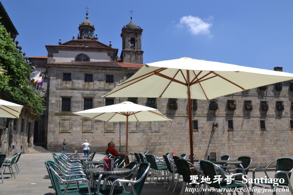 大教堂正門面對著Obradoiro廣場,廣場北側建築物是舊皇家醫院,現在改建成國營旅館,大廳的裝潢擺設十分豪華,中庭設計典雅美麗,飯店庭園咖啡館的氣氛還不錯,兩人就坐下來用餐,喝杯清涼飲料,消消暑氣!