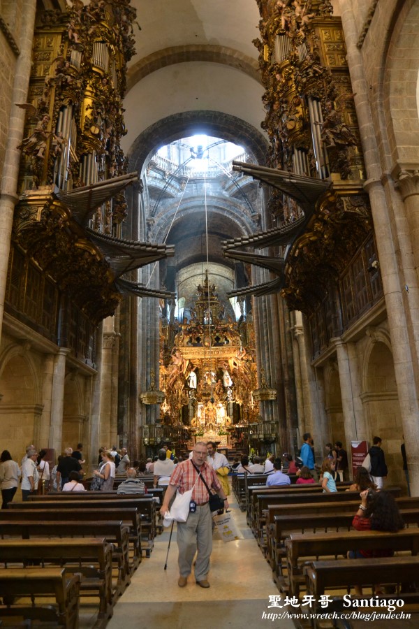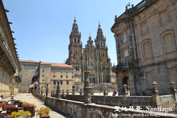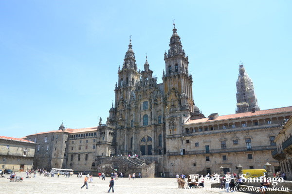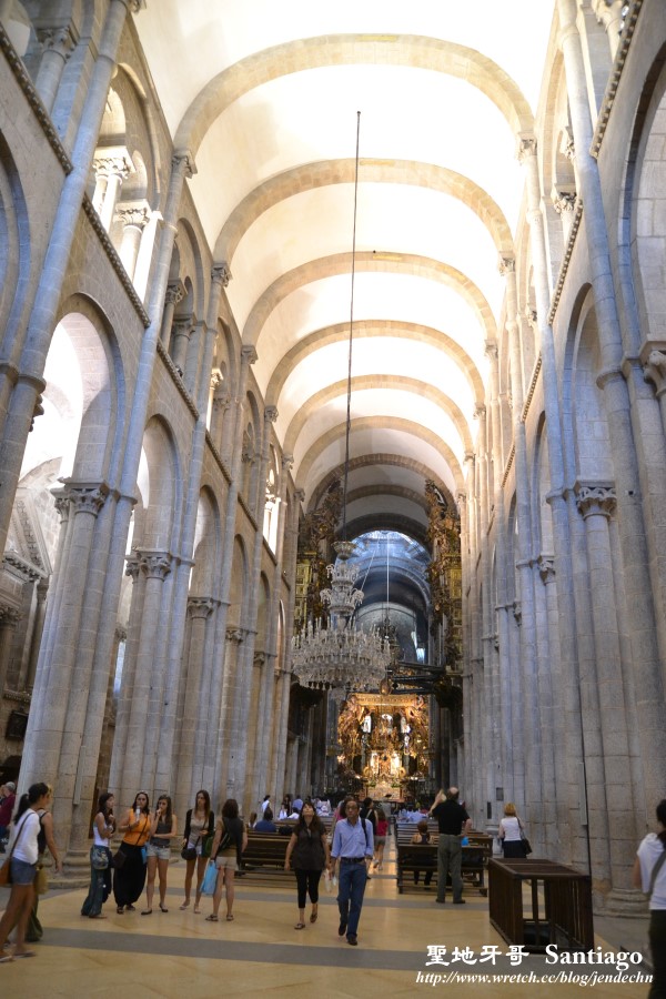 聖地牙哥的大教堂從9世紀初就開始建造,漫長的歲月中,經歷改建過,也曾遭破壞過,現今所存的美麗建築物是11~13世紀所建,羅馬式、巴洛克式和銀匠式的綜合體,站在高聳的大教堂前,可以強烈感受那莊嚴肅穆的氣氛和那歷經漫長歲月的歷史痕跡。在西班牙參觀教堂,大部分都須花錢買門票,而且教堂內部大都不能拍照,而聖地牙哥的大教堂,除了參觀特別的展覽室需付費外,入內參觀並不需買票,而且也沒有禁止拍照。