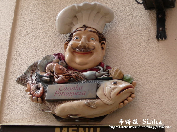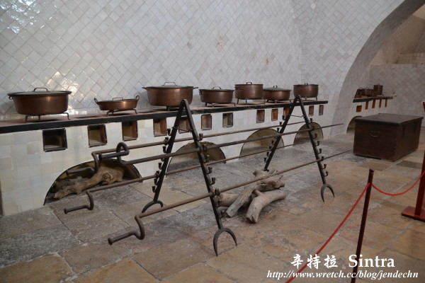 由奧比都斯Óbidos開車到辛特拉很快就可到達,這天遇到週六假日,遊客多了些,到達辛特拉市區時找不到車位,只好再繞一圈才找到車位,停好車,到路口的遊客中心拿份資料後,就先參觀旁邊的國家皇宮(Palacio Nacional de Sintra)。這個皇宮從14-18世紀修建多次,建築融合了哥德式、摩爾式還有葡萄牙式風格,在葡萄牙成立共和制以前,一直是國王的避暑宮殿。皇宮的外部最吸引人的是屋頂上那兩根高大的圓錐型白煙囪,很少在其他城堡見過像它這樣強調灶腳位置,煙囪底下是寬敞的廚房,各式銅製的巨型鍋碗瓢盆依然留在爐台上讓人參觀,真是一個「懂得吃」的皇室啊!皇宮的內部裝潢也很特別,牆壁和屋頂的磁磚貼圖最吸引人,採用各式的動物和植物圖騰,其中最大的「天鵝廳」裝璜極美,天花板上描繪著27隻不同姿勢極為生動的天鵝,還有裝飾著美麗花磚壁畫及貴族徽章的「徽章廳」也很華麗。