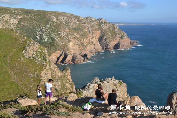 由里斯本出城到Almada不需付費,但回到里斯本則需付過橋費(1.45€)。離開基督像後,先到里斯本西邊的貝倫區(Belem),接著沿海岸線來到距離里斯本40公里的羅卡角(Cabo da Roca)。羅卡角是歐洲大陸的最西端,跟著衛星導航走,開在蜿蜒山路上,一路盡是綿延起伏的山丘,車速無法太快,雖然離里斯本距離不遠,車程卻花了將近一個小時。羅卡角的地點偏遠,如果沒有自行開車,可以坐巴士前往,但是巴士並不是如此頻繁,需注意開車時刻,遊客中心前面就坐了一長排等巴士的遊客,有群年輕人等累了,乾脆坐在地上玩起牌來。