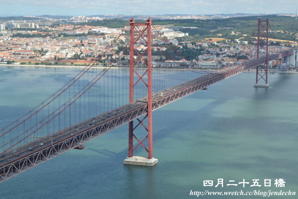 前往基督像,必須開過橫跨太加斯河的 四月二十五日 橋(Ponte 25 de Abril), 1966年通車的 四月二十五日 橋,是舊金山大橋的姐妹橋,出自同一家公司,原來稱作Salazar 橋,為了紀念葡萄牙爭取自由民主革命成功,以革命當日的「4月25日」命名,橋樑全長 2278M,是世界第三長吊橋,也是歐洲最長吊橋。車子開過 四月二十五日 橋,跟著衛星導航走,穿過大街來到小弄,路越走越窄,正在懷疑導航是否故障時,終於看到了巨大的基督像。看到高高在上的基督像,會被它的宏偉震攝住,驚覺人類的渺小!付了每人5€的門票,坐電梯到基督像頂端的瞭望台,走出電梯後,還要爬上一段狹小的樓梯才能到達,瞭望台的視野十分遼闊,對岸的里斯本市區及海峽周邊都能看的一清二楚,從這裡觀看 四月二十五日 橋是最佳的地點,最好選擇早上前往,這時的陽光角度比較適合拍照。