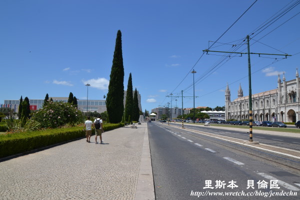 貝倫區位於葡萄牙首都里斯本(Lisbon)的市郊,離市中心區遠了些,由市區坐電車車程大約30分鐘,這裡地點雖然偏遠,卻囊括了里斯本最熱門的景點。我們由基督像出發,經過4月25日橋進入里斯本市區,過橋後跟著路標走,很快就會到達貝倫區Belem。車子一靠近Mosteiro dos Jeronimos 修道院附近,馬上有熱心的「非洲裔」人士靠過來,引導你將車停在路旁的免費停車位,為了避免惹麻煩,我們當然給了點小費,就當作看車費吧!