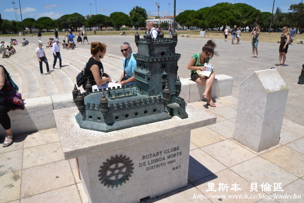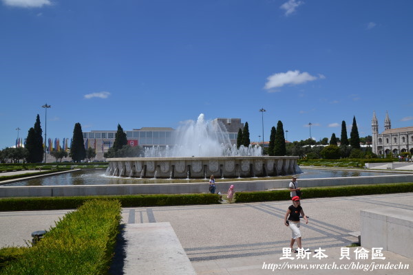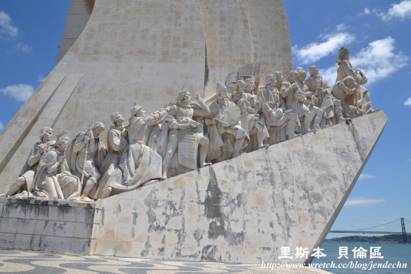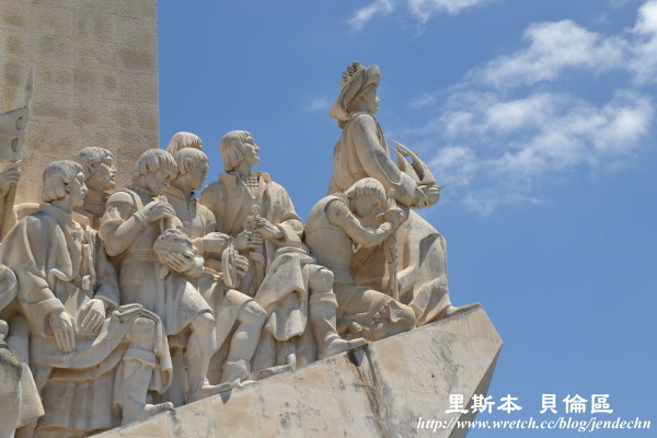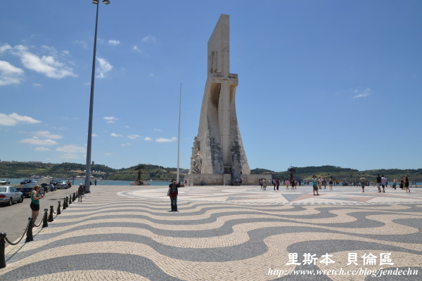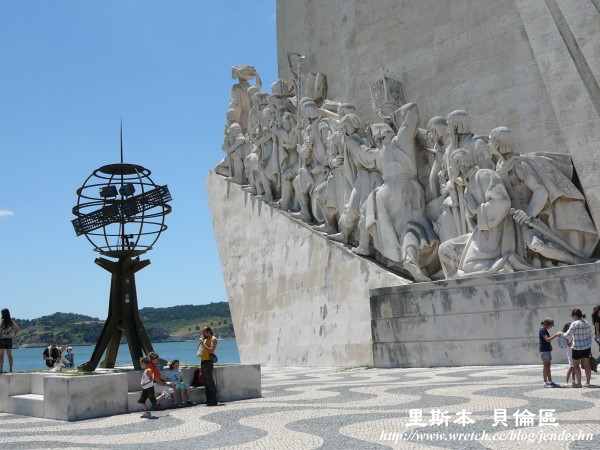 貝倫區的景點不少,彼此距離都不遠,將車停在Jeronimos 修道院旁的馬路上,徒步參觀其他景點。Jeronimos修道院建於1502年,是葡萄牙最大的教堂,外型十分宏偉華麗,是座美麗的白色大理石哥德式建築。由修道院走地下道,穿越了馬路就來到了岸邊的「航海紀念碑」 (Padrao dos Descobrimentos)。航海紀念碑建於1960年,是為了紀念航海王子亨利逝世500年而建,紀念碑的外形像艘大帆船,帆船兩側刻著一長列的雕像,船頭站立的是亨利王子,在其後為發現歐洲至印度航線的加瑪,接在後面的是隨同出發的航海家、葡萄牙歷史上的名將、傳教士和科學家等。紀念碑廣場的地上有幅世界地圖,上面刻有發現新大陸的日期,地圖上站了不少遊客,每個人都忙著找尋自己的國家位置,我們當然也認真的找「台灣」,只是台灣的形狀實在不怎麼像?