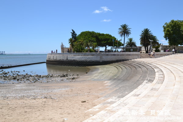 沿著岸邊走到貝倫塔(Torre de Belem),這座塔建於1500年,也是里斯本有名的地標,雖然稱為「塔」,其實更像一座古堡,整座塔全用白色大理石建造,是葡萄牙文藝復興式代表性建築,外觀雕刻裝飾深受回教文化影響,曾作為燈塔看守進港船隻,塔的底層地下室,以前是座水牢。參觀的這一天,天氣十分炎熱,即使熱愛陽光的當地人,也都躲入了餐廳內或樹蔭下,貝倫塔附近的餐廳,幾乎家家都客滿,我們也是好不容易才找到了座位。