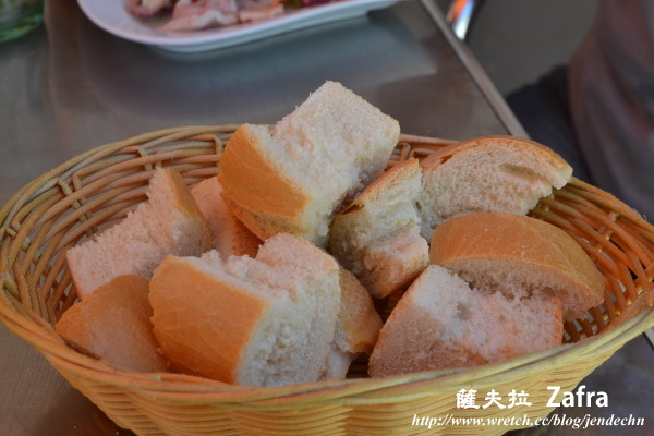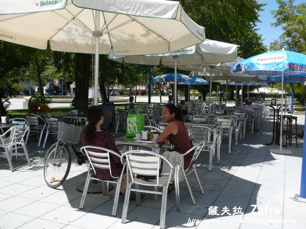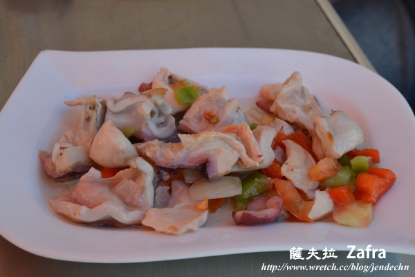 穿梭在薩夫拉美麗的大街小巷中,回到西班牙廣場旁邊才用餐。這一餐美味又平價,大大盤的「Tapas」每盤才2歐元,隔壁桌坐了一群可愛的中學生,對東方人好奇吧,羞澀的和我們打招呼,看到我們拿起相機拍餐點,覺得好玩,全桌嘰哩咕嚕不知說些什麼,突然整群笑的東倒西歪,連我們倆也被逗笑了!
