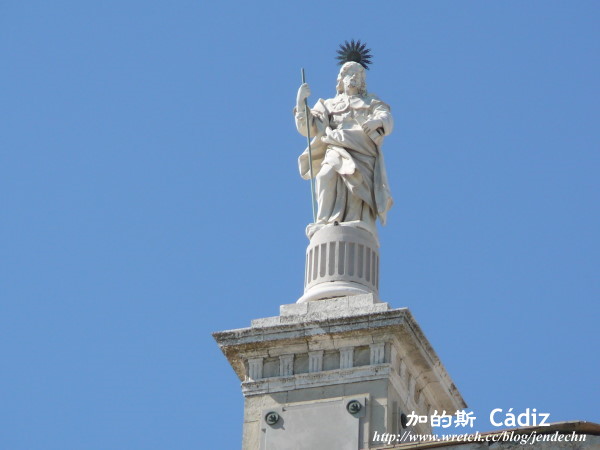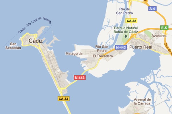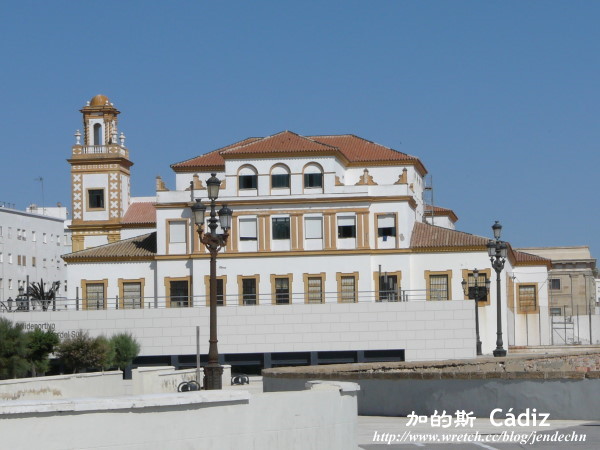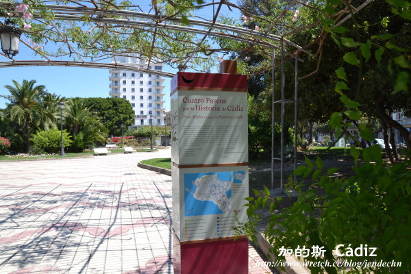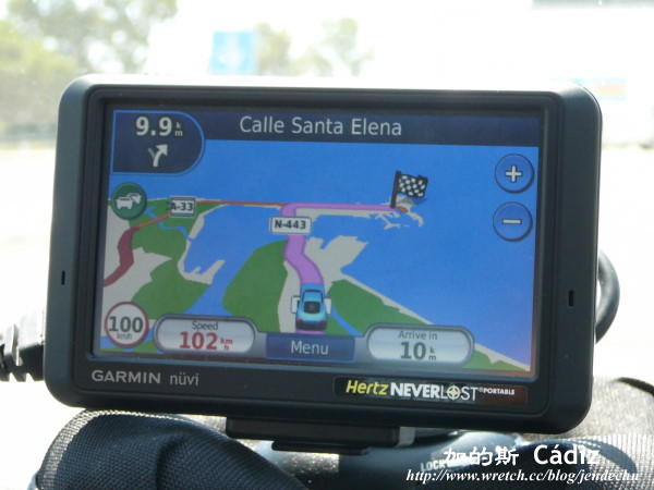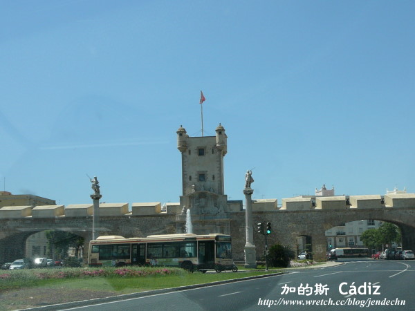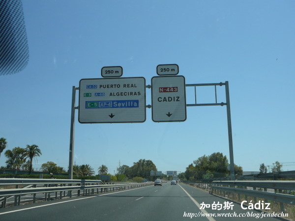 離開赫雷斯後,繼續走A4接N443往南開到面對大西洋光明海岸的加的斯(Cádiz),赫雷斯到加的斯車程大約30分鐘。看到衛星導航上的地圖,嚇了一大跳,這是一個地型十分特別的城市,細細長長,四周幾乎都被海洋包圍住,簡直是個被隔離的城市,靠著N443道路橋樑,跨海和伊比利半島相連。看到書籍資料顯示,加的斯可能是歐洲最古老的城市,在西元前1100年,由腓尼基人建立的貿易城,哥倫布發現新大陸的航海之旅,好幾次都是從這裡啟航,當時這裡十分繁榮興盛,目前這裡仍是西班牙重要的商港兼漁港。