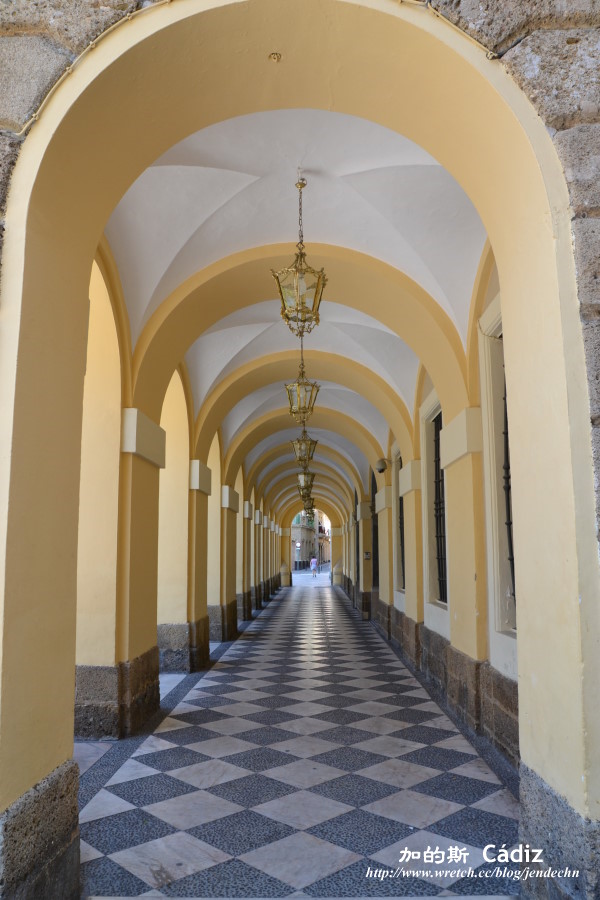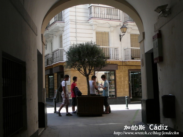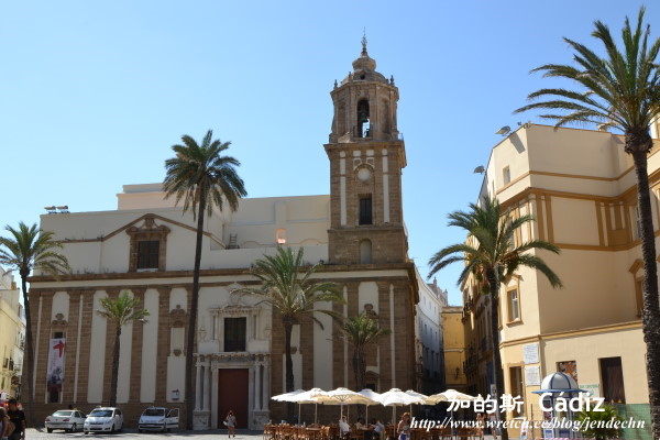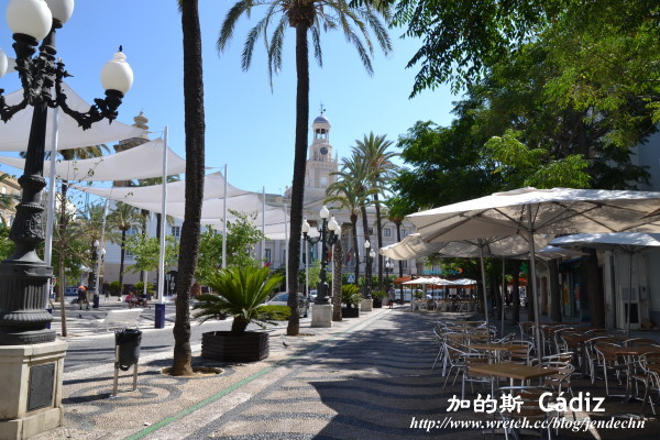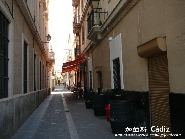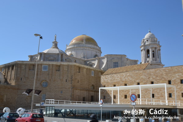 車子停在港口旁的地下停車場,遊客中心就在停車場上方,舊城區主要觀光景點都在這附近,先在旁邊的餐廳吃點東西再去參觀。拿著地圖找路,這裡的巷弄路標標示不是很清楚,很容易迷路,先到Pza. San Juan de Dios廣場,美麗的市政廳大樓正對著這個廣場,西班牙的陽光高照,很多廣場都會用白色布幔遮陽,反而變成了獨有的特色。由市政廳穿梭巷弄間,到達大教堂廣場,加的斯的大教堂建於18~19世紀,正面正對著大西洋,有著十分醒目的黃色圓頂,是這個城市的重要地標。海邊的視野寬廣,本來想沿著大教堂旁的海岸走,烈日下,海風吹來盡是熱騰騰的風,走沒多久,兩人決定,還是走進迷宮似的巷弄間,躲避那如烈火般的艷陽!