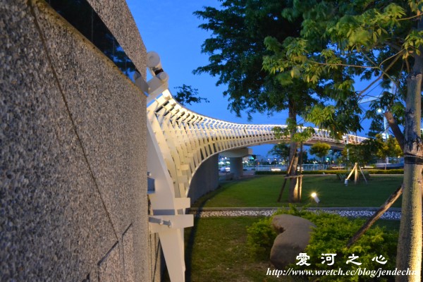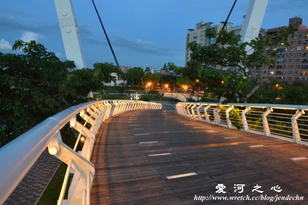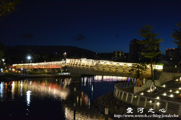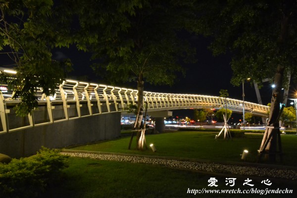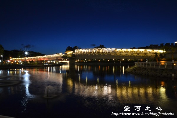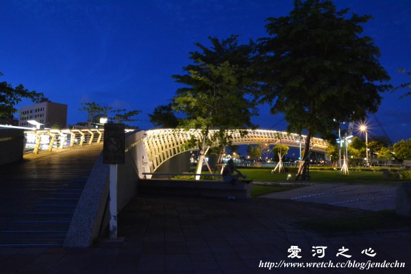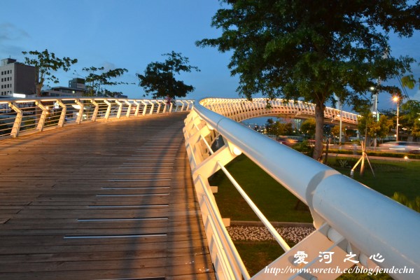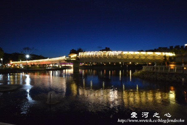 夜晚的「愛河之心」和白天有著不同風情,白天突顯現代建築的知性之美,當天色漸暗,橋上的彩色燈光亮起,燈影映在水上,夜色隱約朦朧,有著一股溫柔的美。