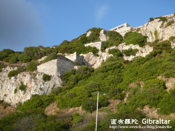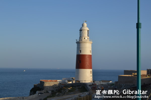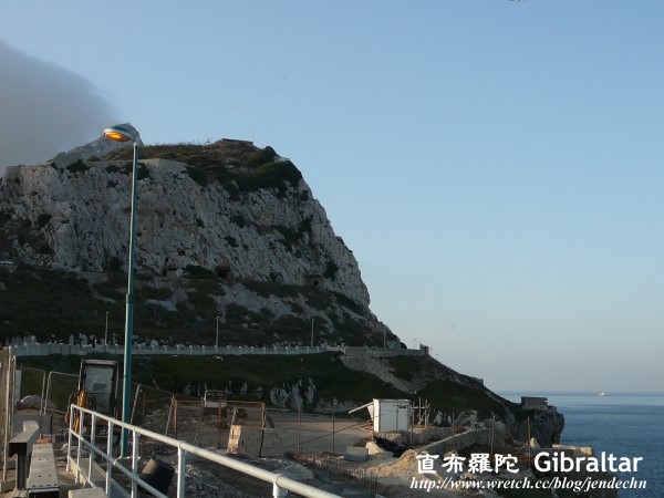 直布羅陀很小,開車直接繞一圈,不到二個小時就走透透,最主要的景點是令人望而生畏的巨岩(Rock of Gibraltar),根據希臘神話,這個巨岩是大力士海利克斯所立,從西班牙遠遠就能望見這塊魁武壯碩的岩石,這裡也成了直布羅陀最重要的地標,巨岩頂端是自然保護區,有纜車可到達。進入直布羅陀,建築風格和招牌文字和西班牙迥然不同,流露著濃厚的英國風情。沿著海岸開,穿過一個個隧道,來到直布羅陀最南邊的「Europa Point」,一下車,兩人就強烈感受到海邊的風勢強勁,冷冽的風讓兩人直哆嗦,和前一天的艷陽高照溫差實在太大。「Europa Point」停車場旁的白色高塔建築十分醒目,相較下,那個海邊孤立的燈塔就顯得遜色多了,「Europa Point」海邊公園正在施工中,稍顯凌亂。站在Europa Point海邊,望著直布羅陀海峽,迷濛海色中,輪船來來往往,眺望更遠處,依稀看到非洲陸地呢?