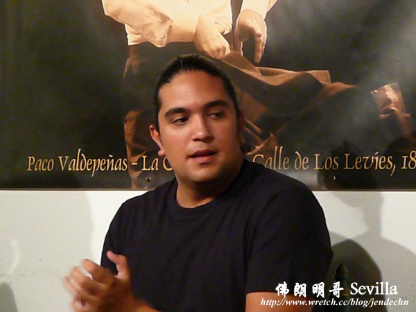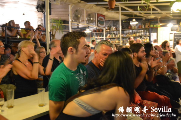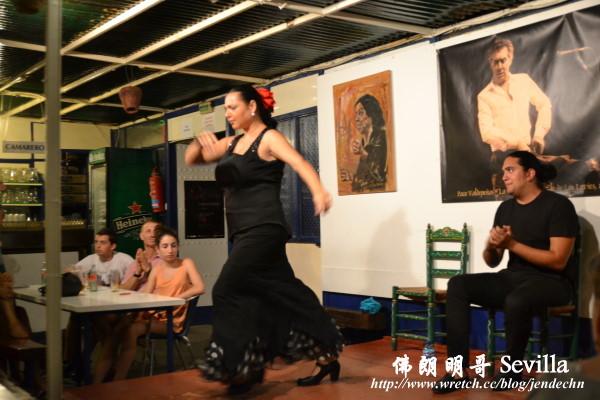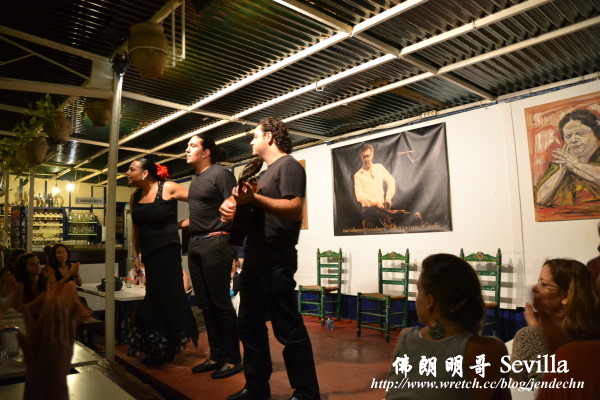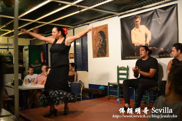 走進門內,才發現裡面別有洞天,酒吧內已經坐了不少遊客,視線比較好的位置都坐滿了人,表演舞台就在兩家酒吧中間,舞台素樸不華麗,簡單的長條木桌。我們早到了半小時, 10點半才開始表演,會持續到半夜4點,越晚越熱鬧。快到開場時間,遊客越來越多,表演三人組走上舞台,當渾厚的聲音由歌手詠誦而出時,全場鴉雀無聲,全都沉醉在那富磁性、充滿感情的歌聲中,歌手吟唱幾分鐘後,佛朗明哥舞者自座位站起,用那雙炯炯有神的雙眼看著觀眾,雙手緩慢跟著音樂拍擊,接著動作逐漸加速,突然手用力一拍,腳一蹬一踢一轉身,全身充滿著力與美,隨著音樂越來越激昂,舞者的動作也越來越熱情狂野,全場觀眾也激情的大喊著「Ole」「Ole」!