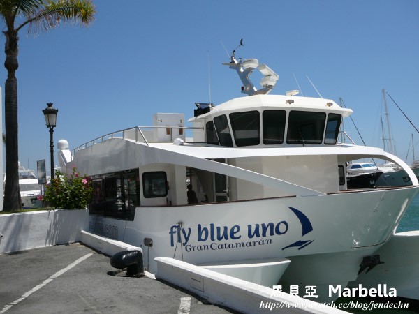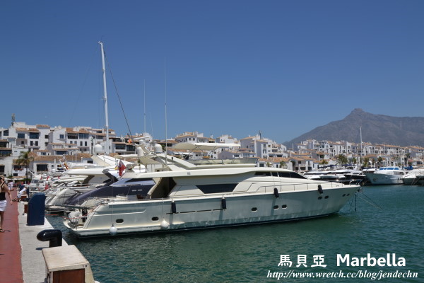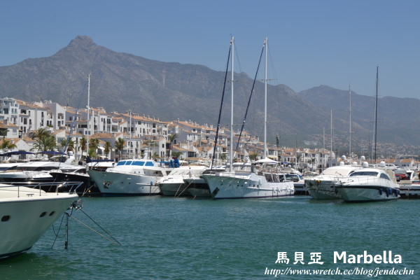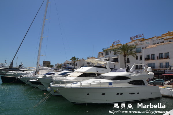 由隆達(Ronda)走A397公路,由山區高原往海邊方向行駛,大約1小時就可到達,直接將車開到馬貝亞最著名的度假區-帕努斯港「Puerto Banús」。將車停入飯店的地下停車場,一走出停車場,強烈的海風迎面而來,越往海灘方向走,風勢越強勁,捲起的沙塵就像恆春半島的風吹沙般,本來兩人想到海邊游泳,走了一半,在強風攻勢下,打了退堂鼓。離開沙灘,往內灣碼頭方向走,這邊的風勢在建築物的遮蔽下,溫馴多了!