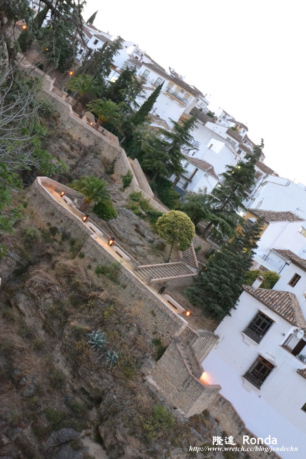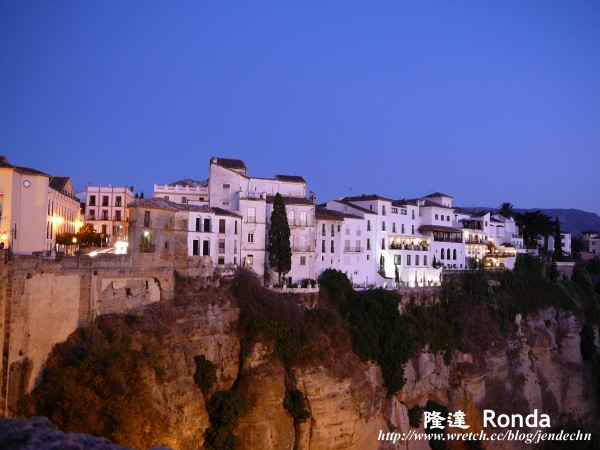 過了Puente Nuevo新橋,就來到舊城區,舊城區的街道比較彎曲狹窄。由Puente Nuevo新橋走小巷到舊橋Puente Viejo,雖然路程不遠,但大部分為石階坡道,才走沒多久,就令人氣喘吁吁,前面的外國小孩走不動了,耍賴的想要爸媽幫忙,口中直喊著「Help!Help!」,那模樣可愛的讓人發笑!大概是山區,陽光被遮蔽,這裡太陽下山時間比平地早很多,走到舊橋時,夜色已暗,燈火逐漸亮起,急著走回頭拍攝新橋的夜景,Puente Nuevo新橋在燈光照耀下,增添了一股柔和嫵媚的風情,擺脫了那白天讓人畏懼的印象!親臨隆達後,更是愛上這個古老山城,來安達魯西亞,千萬不要錯過!
