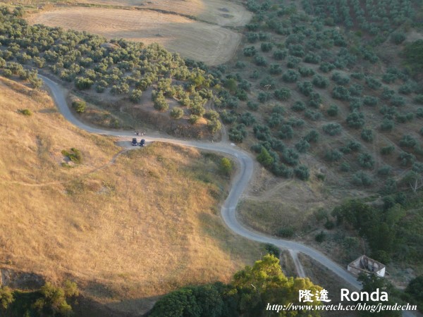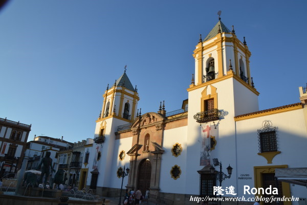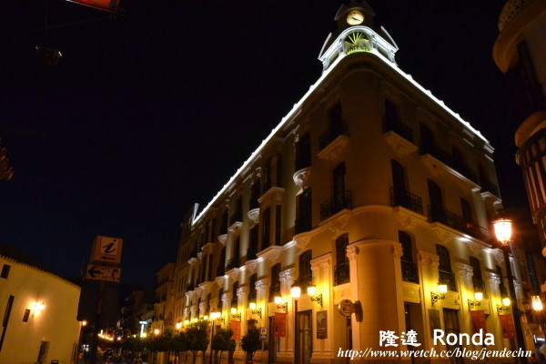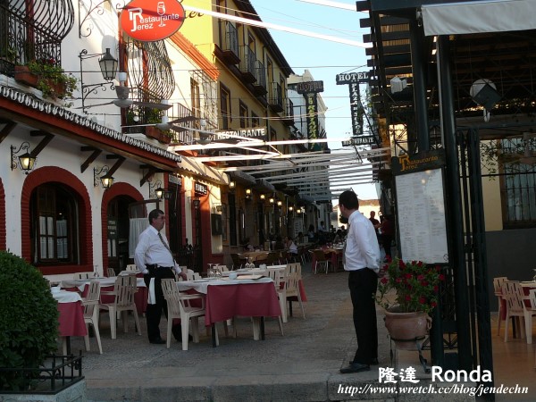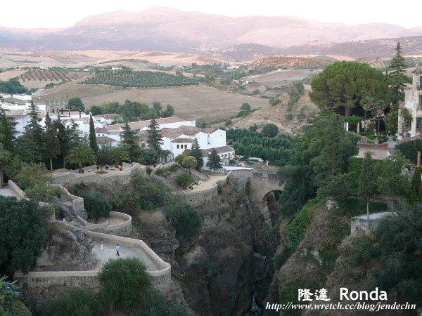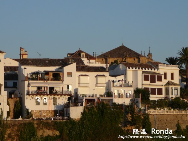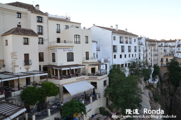這家五星級國營旅館位於Puente Nuevo新橋旁,旅館前的廣場就是西班牙廣場,旅館建在河谷斷崖上,橋下的斷崖深達100公尺,往下俯瞰深邃陡峭的斷崖,實在令人發毛,那股強烈震撼的臨場感,在照片上很難深刻感受。河谷兩旁斷崖上,開了一家家的餐館,蔚為奇觀,一整排壯觀的白色懸屋,完全不輸西班牙中部的昆卡(Cuenca)。站在Puente Nuevo新橋旁的觀景廣場可以看到河谷遠方另一座橋「舊橋Puente Viejo」,只可惜到達時的光線來向不佳,無法盡情捕捉那美麗的峽谷風情。
