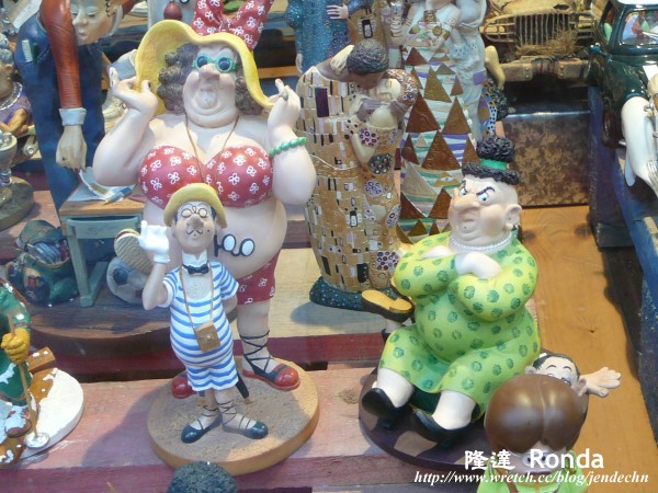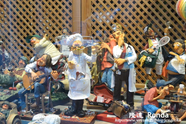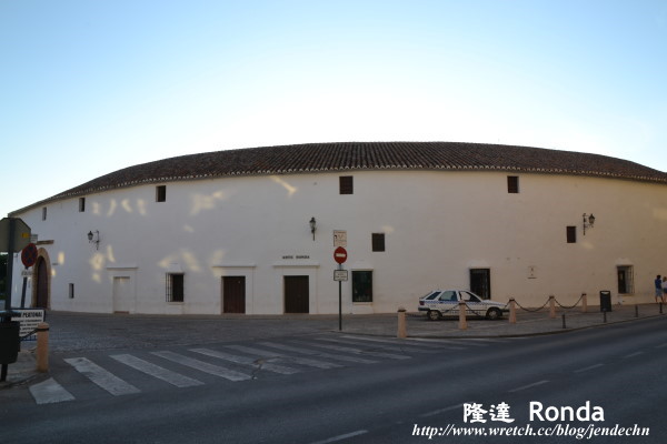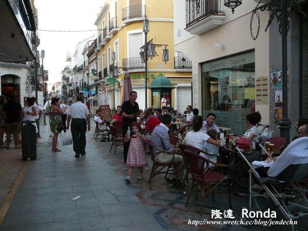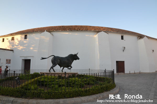 我們午休片刻後,才出門市街觀光。旅館旁的街道直通到河邊,這條路是隆達重要的觀光路段,街道兩旁開滿餐館和商店,人潮聚集,街道旁的小廣場上充滿熱情活力,年邁的老人家也都走出了家門,聚集在廣場活動。由旅館走到河邊的鬥牛場,這個鬥牛場歷史悠久,近代西班牙鬥牛的規則,就是由此鬥牛場訂定。走過鬥牛場到河邊,河邊有座美麗的七角觀景亭,可以瞭望遼闊的河谷,沿著河岸,走到國營旅館。