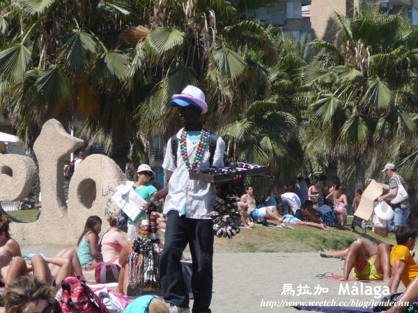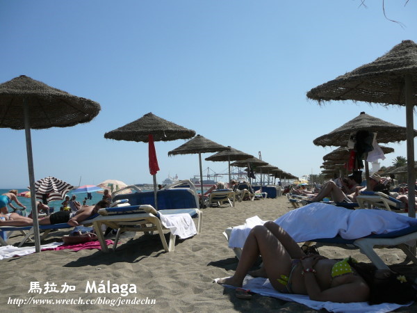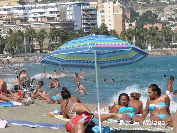 到了太陽海岸的中心,當然得去海邊曬曬太陽了。飯店櫃檯告訴我們最好搭公車前往海邊,偷懶得我們還是把車子開去,在海邊繞了老半天,都找不到適合的車位,又不敢隨便亂停,正在懊惱沒聽櫃台的話時,眼尖的我們突然看到有輛車正要離去,幸運的找到了免費的車位。海邊已經有不少遊客,但下水的不多,都在沙灘上作日光浴,在西班牙的海邊,雖然也看得到天體愛好者,但和法國人相比,西班牙人顯得略為保守些!