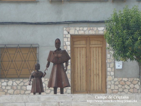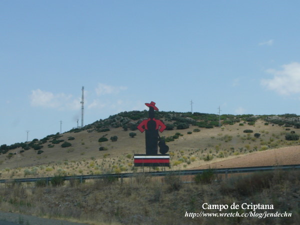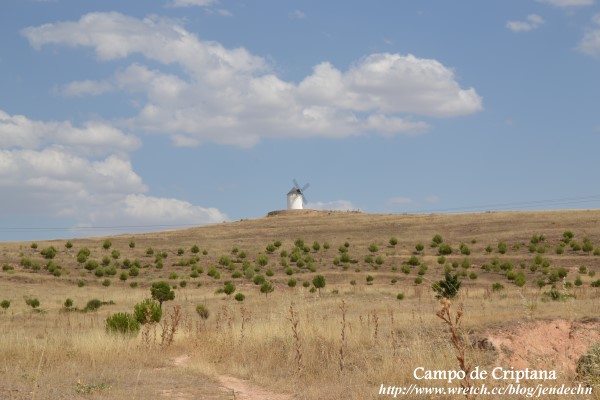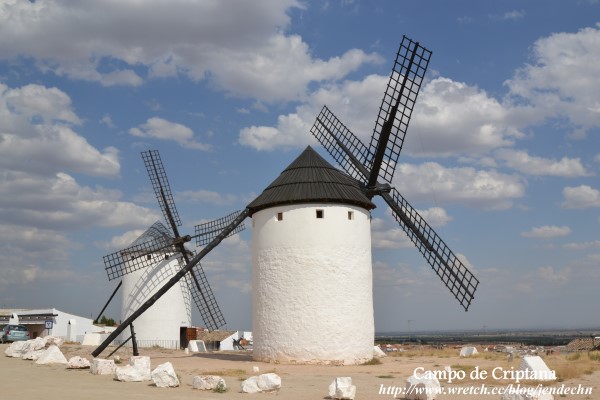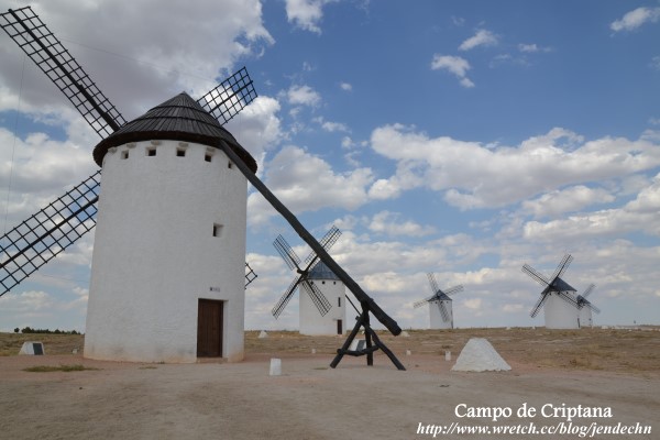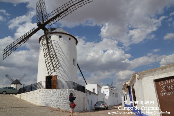 拉曼查地區的觀光景點幾乎都和「唐吉訶德」的故事有關,到處都見得到這滑稽的一胖一瘦騎士二人組雕像,商店所販賣的禮品也都是圍繞著「唐吉訶德」打轉。書中唐吉訶德誤把風車當作巨人布利雷歐,描述的背景就是克利布達那村(Campo de Criptana)的風車。由聖胡安堡開車到克利布達那村不到半小時,跟著路旁的風車指示走,很容易就到達山坡上的風車區。克利布達那村的風車目前大概存留10座左右,所有風車都被取了名字,站在巨大的風車下,人顯得十分渺小。風車旁有免費停車場,只見路邊停了幾部汽車,卻看不到其他的遊客,由山坡上可以鳥瞰村子,整個村子內安靜無聲,杳無人煙,感覺十分冷清蕭瑟!