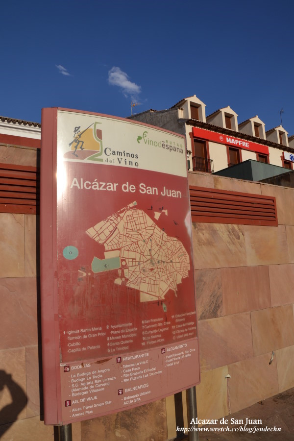 由哥多華直接走A4高速公路,大約三個多小時就可以到達。車子往北走,進入拉曼查地區時,公路兩旁的景色逐漸不同了,這裡是西班牙重要的葡萄產地,原本一望無際的橄欖園變成了寬廣的葡萄園。下了A4高速公路後,轉入N420道路,走一小段葡萄園鄉間小路,沒多久就可以到達聖胡安堡(Alcázar de San Juan),聖胡安堡是拉曼查地區最繁榮的城市,也是此區的交通中樞,飯店和餐館比較多,因此我們決定今晚在此落腳。