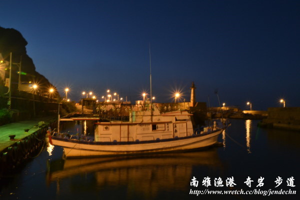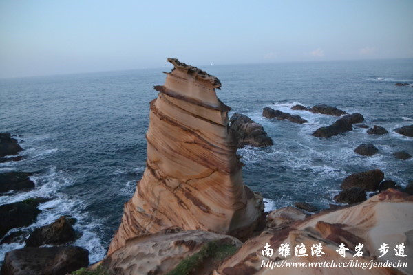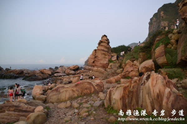 下山時走到奇岩區已經傍晚時分,著名的霜淇淋石上還有一對新人在拍婚紗呢,光線越來越昏暗,半個小時左右回到漁港,坐在港邊吃著肉粽和黑輪,雖然簡單,卻是美味誘人!
