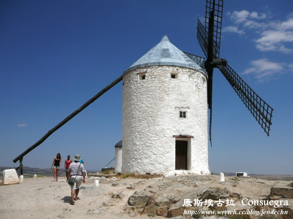 康斯埃古拉是熱門的風車小鎮,和前一天參觀的克利布達那村(Campo de Criptana)比起,這裡的規模比較大,遊客人氣也比較旺,或許是天氣比昨天好,在碧藍天空襯托下的風車更顯壯碩神采,和昨天那份蕭瑟冷清的感覺完全不同。康斯埃古拉的山丘上矗立著11座風車,相當壯觀,第一座風車取名「Bolero」,可免費參觀內部磨粉裝置的動力機械,風車之間還有一座高聳的城堡,目前當作博物館,供人買票入內參觀。