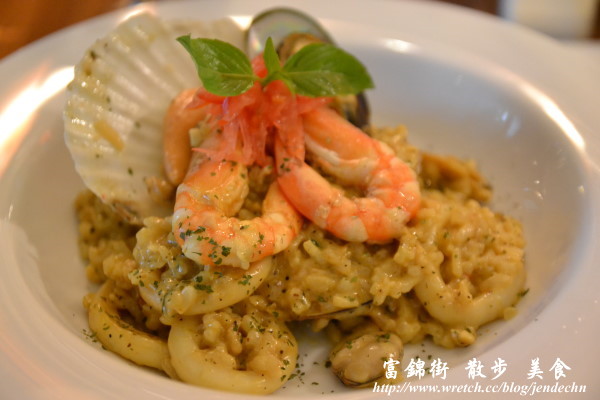 秋末的季節,菩提樹的葉子所剩無幾,雖然略顯淒涼,散步其中卻多了幾分詩意。繞了幾圈,最後決定在有戶外庭園的「富錦街108號」用餐。進入店內時,已接近兩點,服務人員告知廚師即將休息,我擔心的問服務人員,這樣來得及做餐嗎?給了肯定的答案後,我們才放心的點了西班牙海鮮燉飯及德國豬腳。