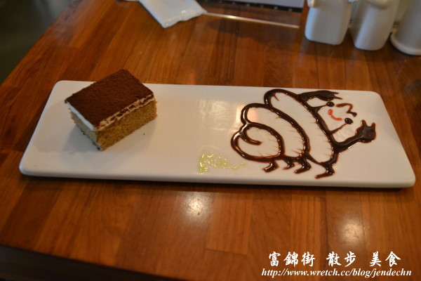 (26) 甜點,長碟子上用巧可力醬畫出不同的圖案,吃起來別有一番風味。