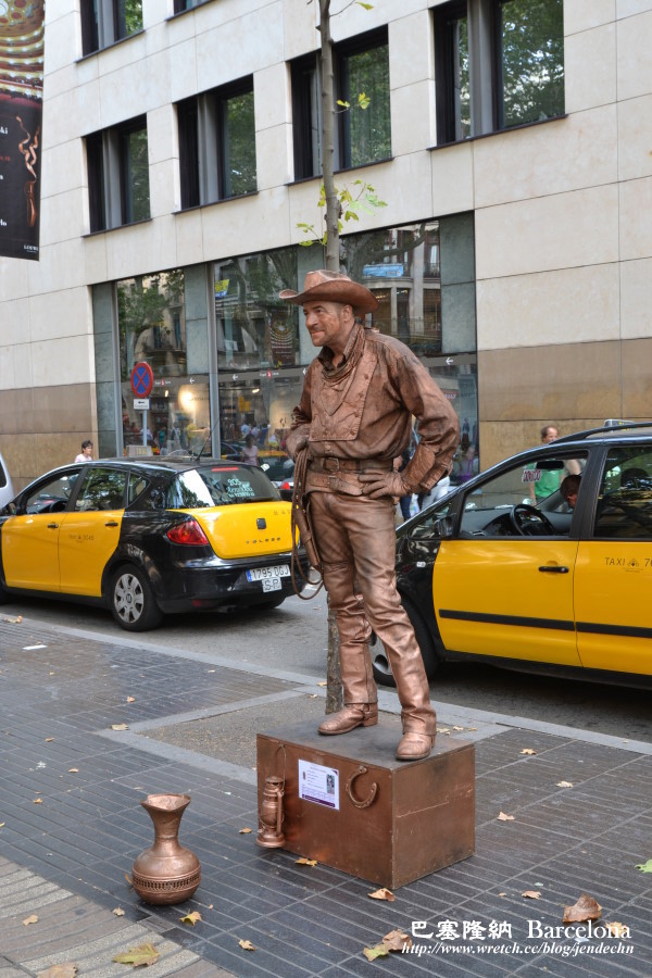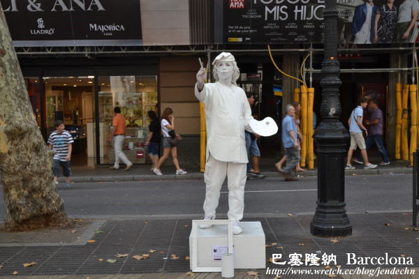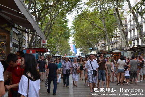 一走出地鐵站,就是位於舊城區北邊的加泰隆尼亞廣場,只要找到廣場旁的蘭布拉大道(La Rambla),沿著大道走,就可以直通港口碼頭廣場上的哥倫布紀念塔。站在加泰隆尼亞廣場旁,往種滿了梧桐樹的蘭布拉大道看去,兩人簡直被那密密麻麻的人群嚇呆了,整條蘭布拉大道上塞滿了遊客,萬頭竄動,完全看不到人群的盡頭。在這裡,可得好好看緊自己的背包。蘭布拉大道沿途,都是專做遊客生意的各式商店,有不少街頭藝人在此表演,大道兩旁的建築古色古香,在利休劇場(Gran Teatre del Liceu)附近的步道路面上,還可以看到色彩鮮豔的米羅鑲嵌畫!