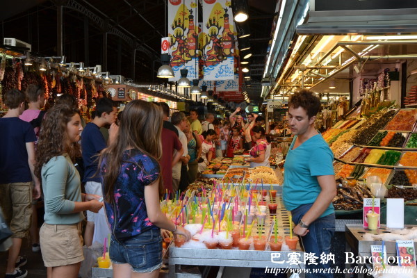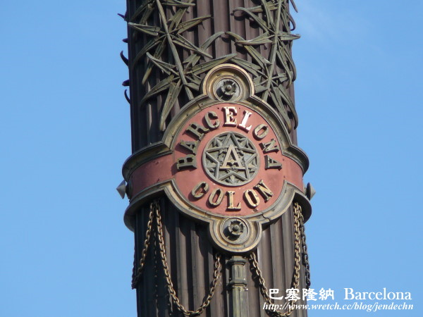 走回蘭布拉大道,很快就到Mercat de La Bogueria市場(這裡原本是聖荷西的卡門教會修道院,也叫Mercat Sant Josep),在市場內買了果汁和新鮮無花果嚐嚐,淡淡的酸甜,很難形容的味道。蘭布拉大道過了利休劇場,會遇到Nou de la Rambla路,桂爾宅邸(Palau Güell)就在這條路上,每人門票10歐元,有關桂爾宅邸部分,後篇再詳談。離開桂爾宅邸,繼續往碼頭走,高聳的哥倫布紀念塔(Mirador de Colon)矗立在前,這座高塔是1888年萬國博覽會時,為了紀念哥倫布發現美洲大陸的偉大貢獻而建造,塔的頂端是哥倫布雕像,他伸出手指,遙遙指向美洲大陸。