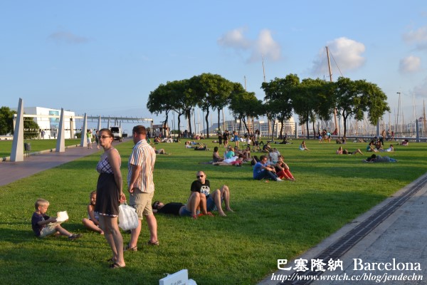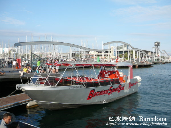 過了哥倫布紀念塔就是海灣區,碼頭上有條美麗橋樑,跨接海灣區的購物中心Maremagnum,這條橋就是海上蘭布拉(Rambla de Mar)。走到海邊時,兩腳已經使用過度,有些痠疼了,坐在岸邊休息,看著熙熙攘攘的遊客,望著靜泊在海灣的船隻,眺望更遠處,海上蘭布拉背後的高塔(Torre de Jaume I)上,幾條纜線拉著由孟特惠克山丘下來的紅色纜車,在碧藍天空中緩緩而行,如詩般的美麗畫面,恍如電影中的場景!