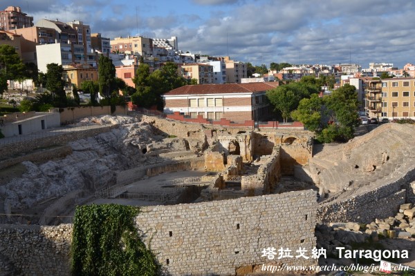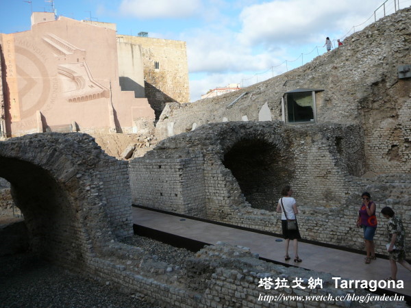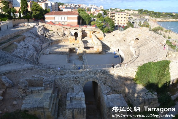 由大教堂繞到弗倫廣場(plaça del Fòrum),這個廣場只剩一堵不顯眼的殘破古牆,廣場上那些露天咖啡座反而比古蹟更吸睛。繞著城牆兜了一圈,來到舊城南邊的考古學博物館(Museu Nacional Arqueològic )、弗倫大會堂(Fòrum Provincial)、希爾克羅馬(Circ Romá),要詳細參觀弗倫大會堂和希爾克羅馬須買票進入,但是這兩處景點站在場外就幾乎一覽無遺了。希爾克羅馬是古城牆的南邊盡頭,站在希爾克羅馬旁的圓環,就能望見那片蔚藍的彎月海灘,可容納一萬多人的古羅馬圓形競技場(Amfiteatre Romá)就依傍在地中海旁,這座競技場雖已殘破不堪,但站在競技場前,仍忍不住想起當年那驚心動魄的人獸戰殘忍畫面!