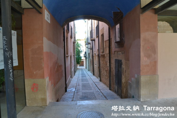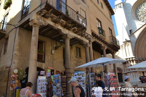 拱門走到大教堂很近,如果快走可能不到10分鐘就可到,但悠閒的走在西班牙古城小弄間,實在浪漫享受,視野所見處處充滿著驚喜,一磚一瓦都是藝術,踩在舖石道上,遙想著二千多年前的羅馬人也在同條路上行走,那是多麼令人興奮的事!塔拉戈纳的歷史遺產留下不少,大教堂這棟1331年完工的建築,和那些羅馬古跡相比,算是新建築了!大教堂前方的小巷,開了家「PAUL」麵包店,這家法國連鎖店,台北也有兩家,新光三越信義區A9館就開了一家,好奇的我們當然要進去比價看看,價錢比起台灣,果然親民了些!