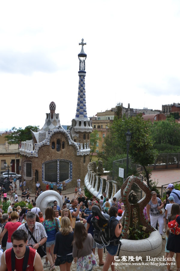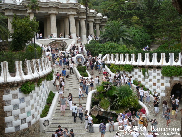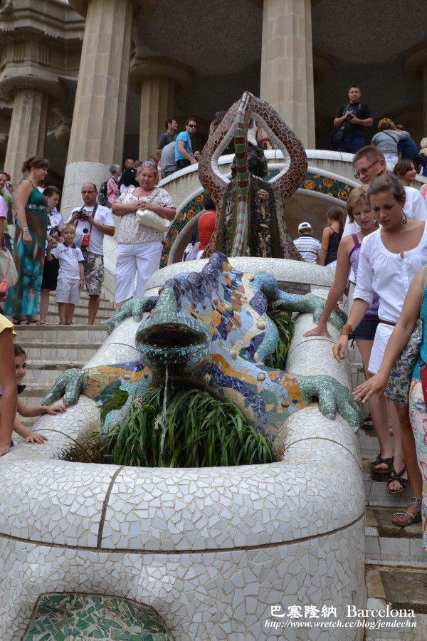 一路由丘陵高處往下走,遠遠就看到了公園廣場上那群擁擠的人潮,到了那座醒目地標「馬賽克磁磚長椅廣場」時,長椅上幾乎都坐滿了遊客,在廣場上,想要好好的拍張照都很難。往下朝大門方向看,只見遊客熙熙攘攘,擠得密密麻麻,七彩大蜥蜴旁擠滿了拍照的遊客,好久才輪到我們。如此偉大而美麗的建築當前,卻因吵雜擁擠的人潮,那最初的感動也消退,變得意興闌珊!